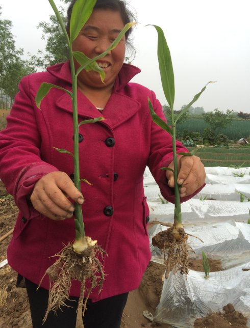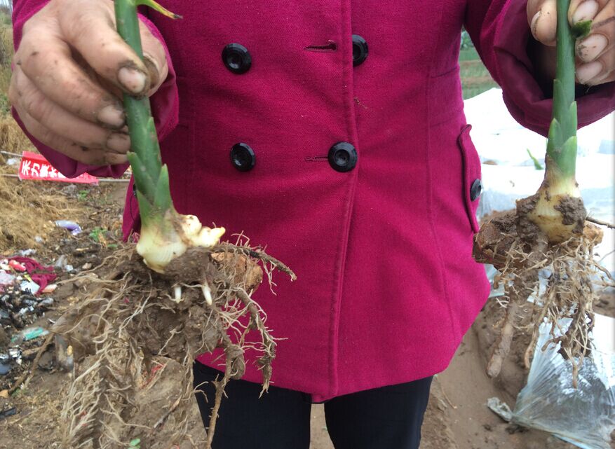 以下几张图片2015年5月28日上午在安丘慈埠拍摄的。大姜示范户任俊友老婆口述:我是5月20日旁晚,按照5斤半亩用的禾力康水溶肥平衡钙镁型(20-10-20-2钙-1镁),过了8天,28日上午公司来人一起看的效果,用了14沟大姜拔出小拱棚后,明显要高些,杆子粗点,叶片发亮;根明显多,又粗又长,二芽也开始萌发了,那边(对照)没用的明显比不过,发棵慢,根系少,根细,白毛根少,二芽也没长出来。禾力康水溶肥用一次这么好的效果,俺真没想到,以后公司有什么优惠活动你们一定要通知我!